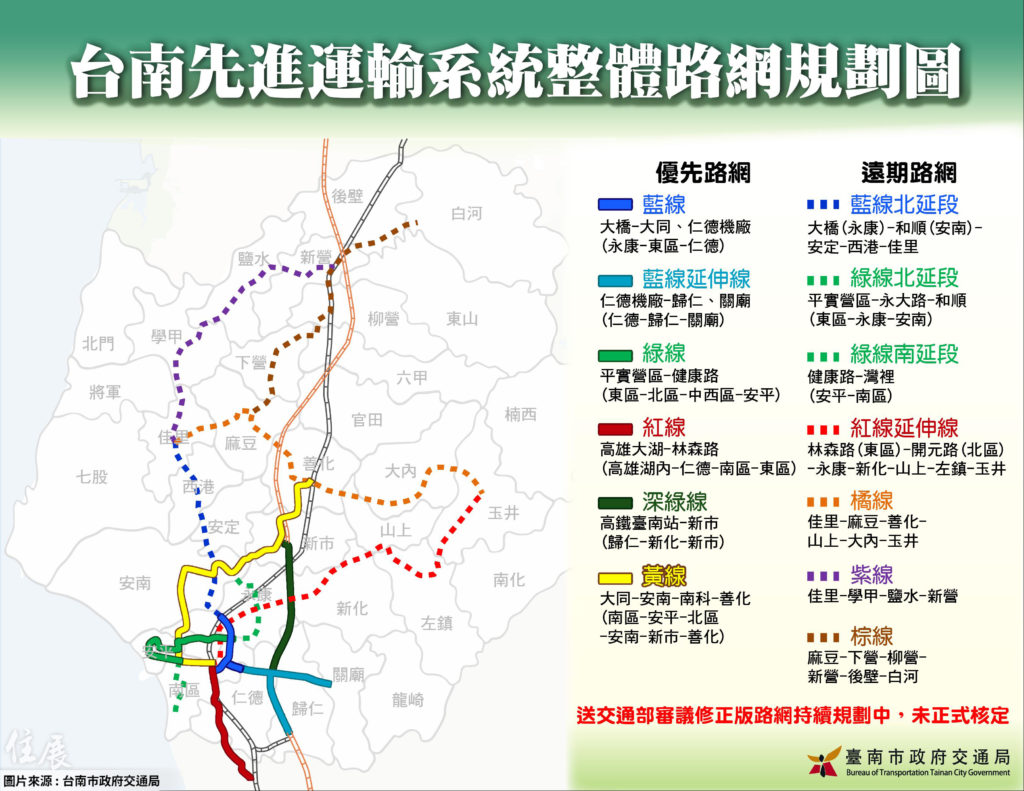 台南市捷運工程處表示,第1期藍線延伸線規劃路線全長14.99公里、15座車站,系統型式將延續第1期藍線採高架單軌系統,目前第1期藍線延伸線可行性研究、第1期藍線綜合規劃報告皆於2022年提報交通部進行審議中,審議過程中回饋意見亦將納入第1期藍線延伸線綜合規劃案內通盤考量。