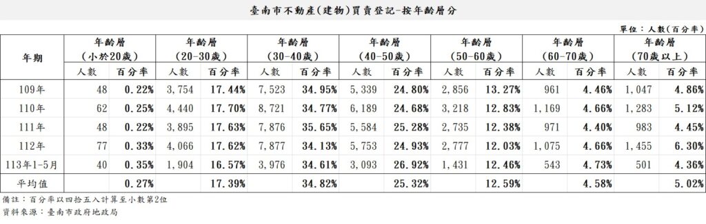 而在購屋年齡的分布方面,用以區分年齡層的7個區間中,數據顯示30至40歲的壯年族群以占比34.82%,成為建物買賣市場上的購屋主力;其次是40至50歲的中年族群,占比為25.30%,綜合兩者表現,顯示在置產與投資方面,已步入職場且具備穩定收入或資產的民眾較積極參與。
