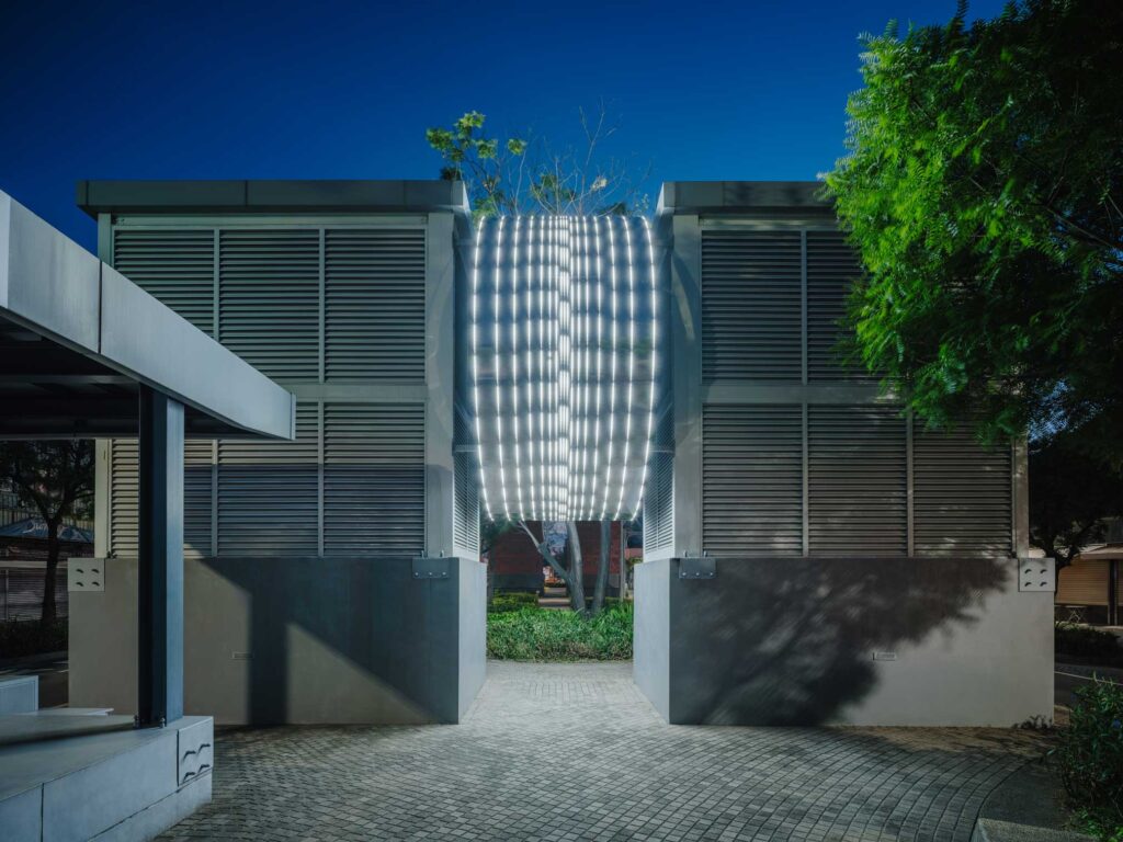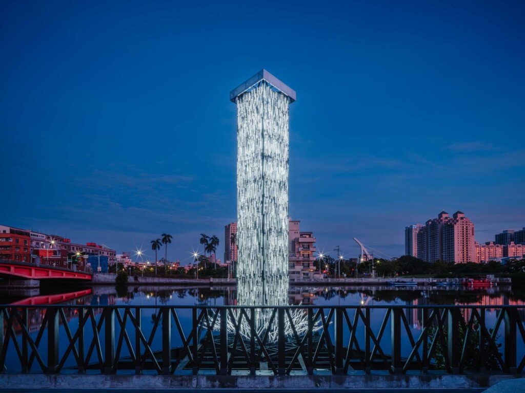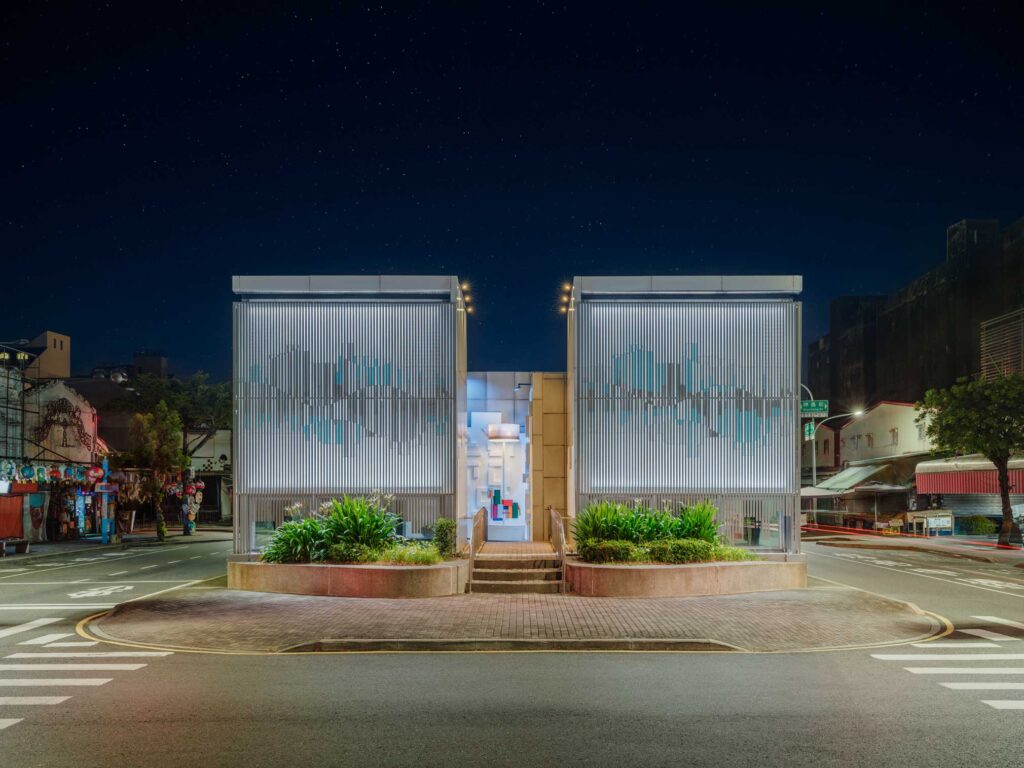 早先的台江內海,曾經陸路與水路交織的五條港,現為人車交織的海安路,歷史發展的多種痕跡藏於城市之中。以水波紋路與疊上不同時期天際線剪影組合的圖樣,與金屬隔柵組成錯視效果。隨著過路的人、經過的車,呈現著若隱若現的樣態,在這條邁向未來的路上。