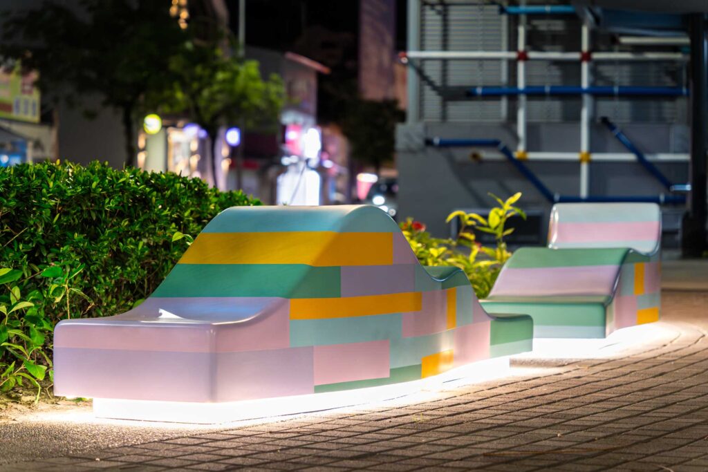 此作品以昔日五條港最南端的「安海港」之水波流動線條輪廓作為造型發想。台南豐沛的山海資源孕育了特有的物產,藝術家擷取在地景觀及物產之色彩,呈現5個溫暖愉悅的色彩,分別為:玉井芒果黃、麻豆文旦綠、五條港水路藍、井仔腳魚塭粉紅及官田菱角紫,呈現古都包容多元文化與熱情的性格,也將欣喜的氛圍挹注在人與人的互動間。
