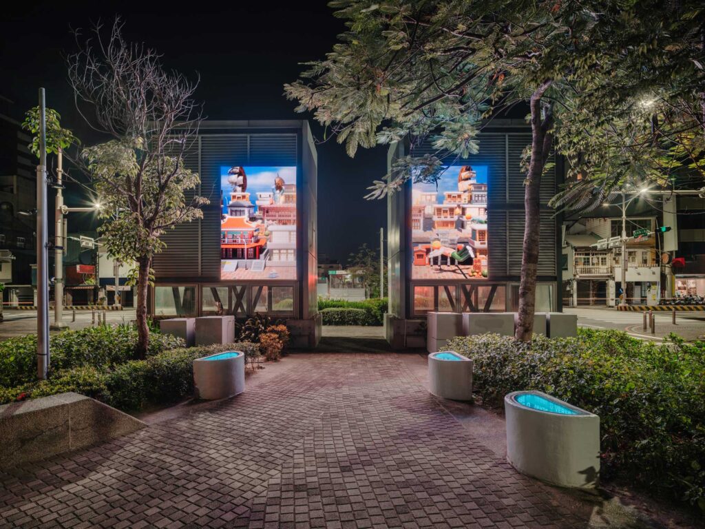 窗,連接內外;曾為府城入口五條港區所在的海安路,就是台灣與世界連接的窗。LED螢幕就像兩扇窗,呈現Verse U這個虛擬鏡像城市的景觀:台南市及海安路的街景元素,與400年間的過往與此刻,在其中交融會合。掃描QR code,觀眾得以由手機創建虛擬角色上傳至此虛擬城市中與其他角色即時互動,使人與人以另一種形式連結!