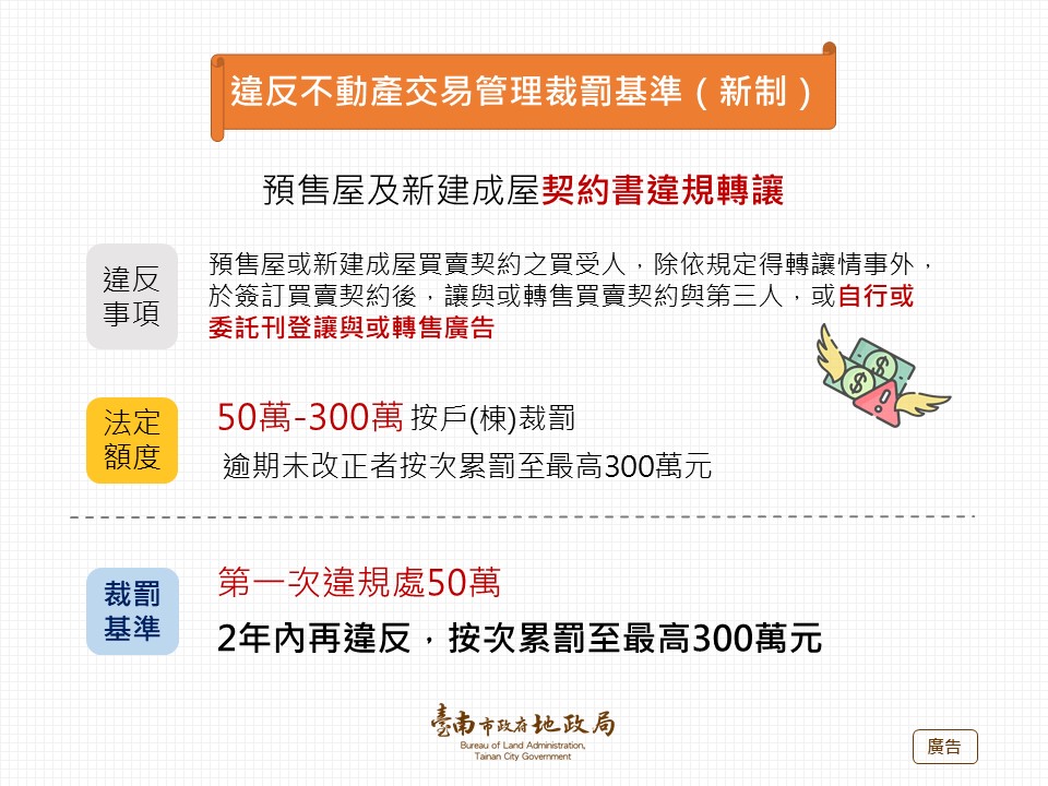 為確保不動產交易價格資訊正確性,杜絕實價登錄與仲介廣告的重複違規現象,台南市政府地政局修訂最新裁罰基準,今年10月1日起正式上路。新制加重處罰重複違規者,違規次數越多,處罰越重,且依據不同類型的違規事件訂定裁罰基準。