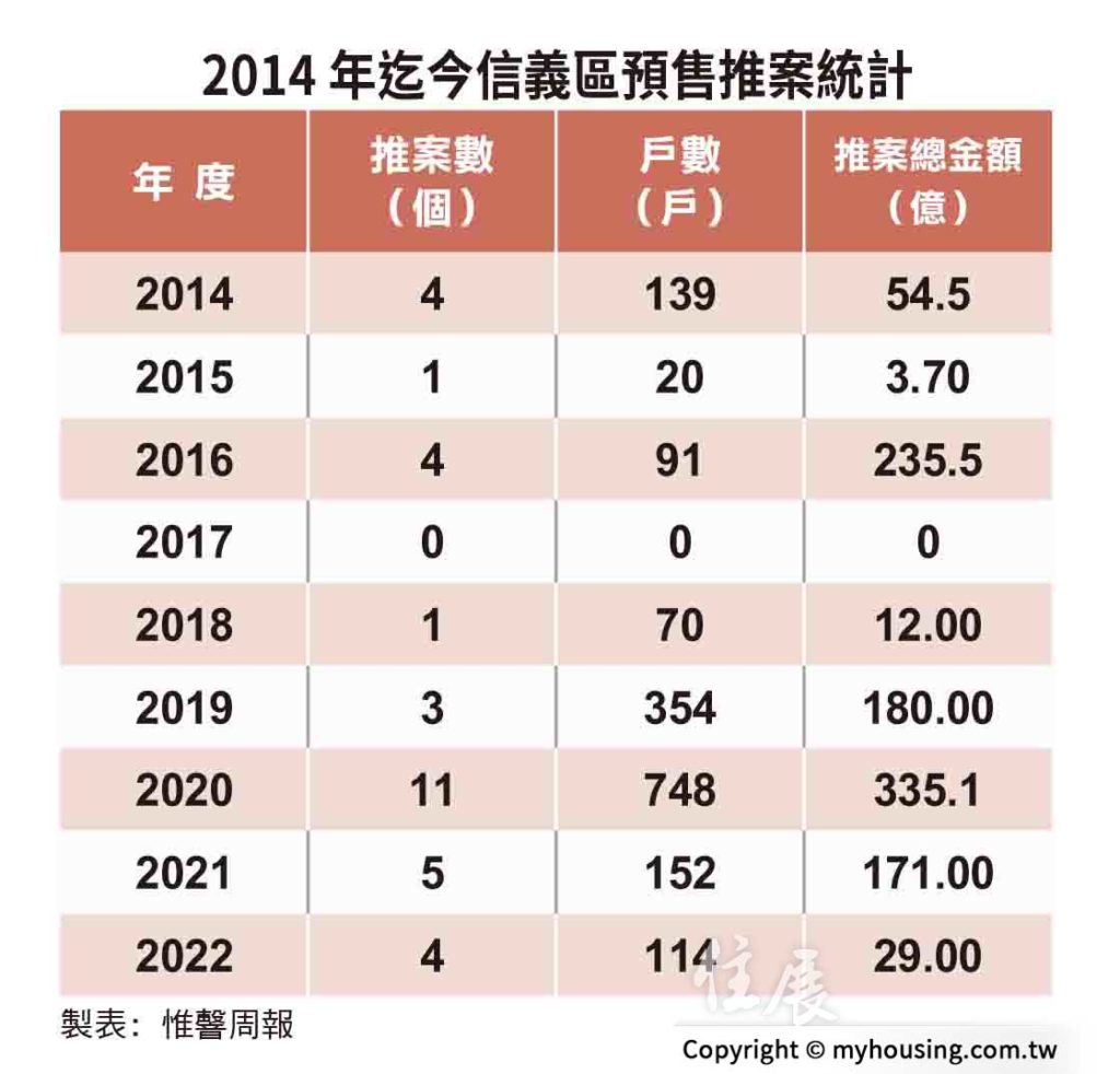 受惠於資金行情,2020年信義區推案量達到819戶,較前一年呈倍數成長,且因房價高漲,總銷售金額達到360億,是全北市前3大供給區之一。加上當時房市景氣暢旺、資金氾濫,推出的建案又多規劃1至3房的小宅產品,總價帶相對較低,因此銷況甚佳,屬北市最熱銷的區域之一。