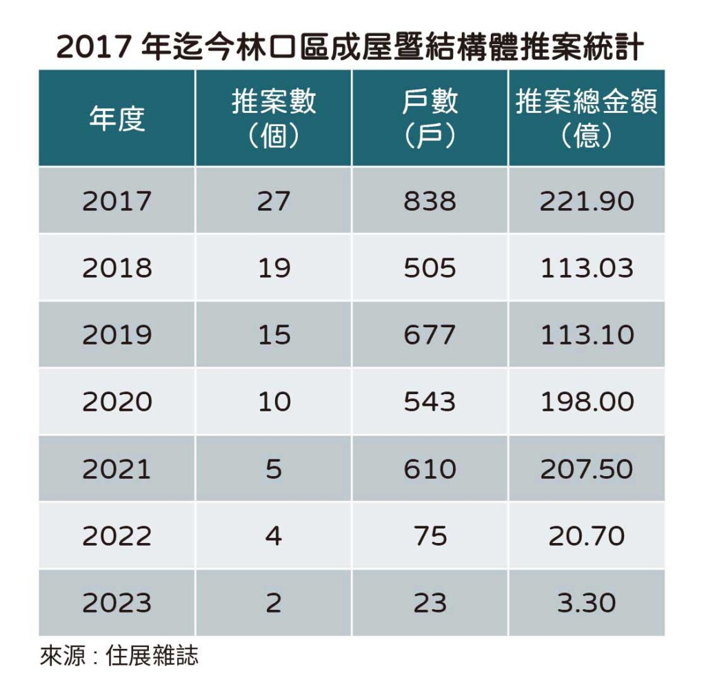 本刊歷史數據資料顯示,土地標售後,林口預售房市的確價量起飛,之後再換為成屋案量大增;但進一步比對發現,這是未消化完畢的預售量體,以新成屋之姿重新進場銷售,代表市場買氣並未隨著建商進駐推案而走升。