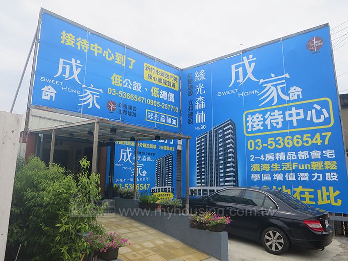 新案首先看到西濱路一段上、紅樹開發(立邦建設)「成家」,屬系列案No.30,規劃90戶(含6戶店面),為24~48坪2-4房格局,頂樓具太陽能板,強調約30%低公設比,因地點相對接近市區,價位也較高,目前主推2房2衛產品,以廣告價560萬起(含車位)促銷。