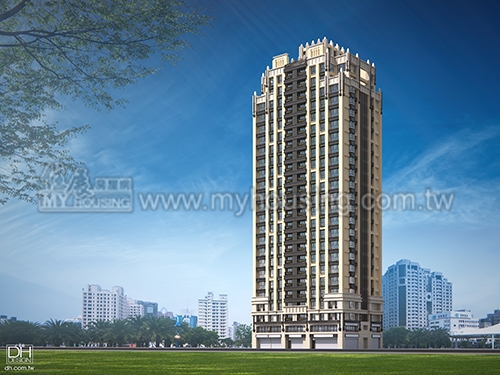 「新天際」強調制震系統,位於幹道旁,近捷運與學區。 |