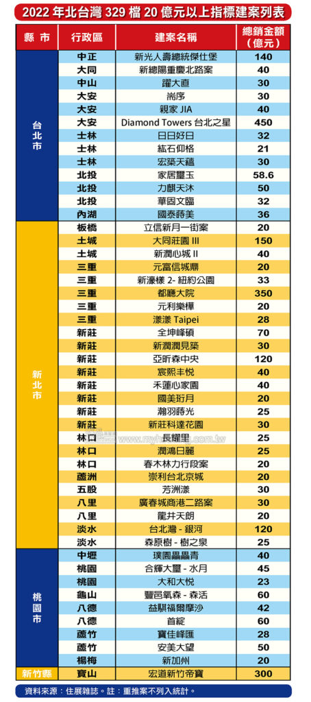 住展雜誌統計資料顯示,今年北台灣329檔期共有「Diamond Towers台北之星」、「新光人壽總統傑仕堡」、「都廳大院」、「大同莊園III」、「亞昕森中央」、「台北灣-銀河」、「宏道新竹帝寶」等7個大型指標案,如此多的百億級建案堪稱史上罕見。