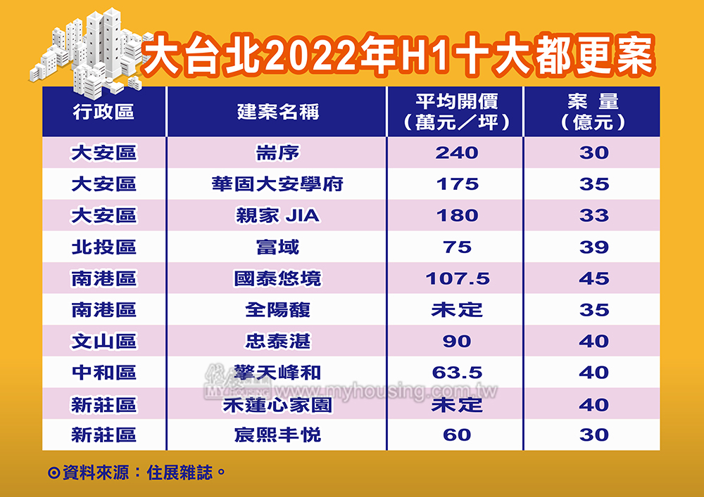 【住展房屋網/綜合報導】據住展雜誌統計,今年截至上半年為止,大台北都更(不含危老)推案仍舊踴躍,推案量達755.9億元,較去年同期增加175.5億元,年增約30%。住展雜誌研發長何世昌表示,今年房市可謂多事之秋,除了政府打房、央行升息、本土疫情爆發之外,還有俄烏戰爭來攪局,使得建商推案意願消極,上半年新建案推案量進入低水位之中,但已經整合完成並取得建照的都更案為了避免夜長夢多,業者無畏大環境不利積極推案,多數都更案銷售都開出紅盤。