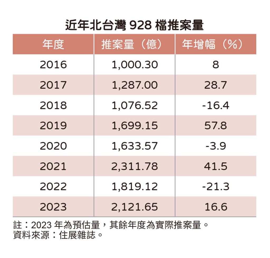 《平均地權條例》修法上路後的第一個房市重大檔期,北台灣新建案市場推案量不減反增,預估將突破2,000億元大關。根據住展雜誌統計,北台灣2023年房市928檔期預估推案量約2,122億元,較2022年同期增加約303億元,年增幅達16.6%,為近八年次高量。