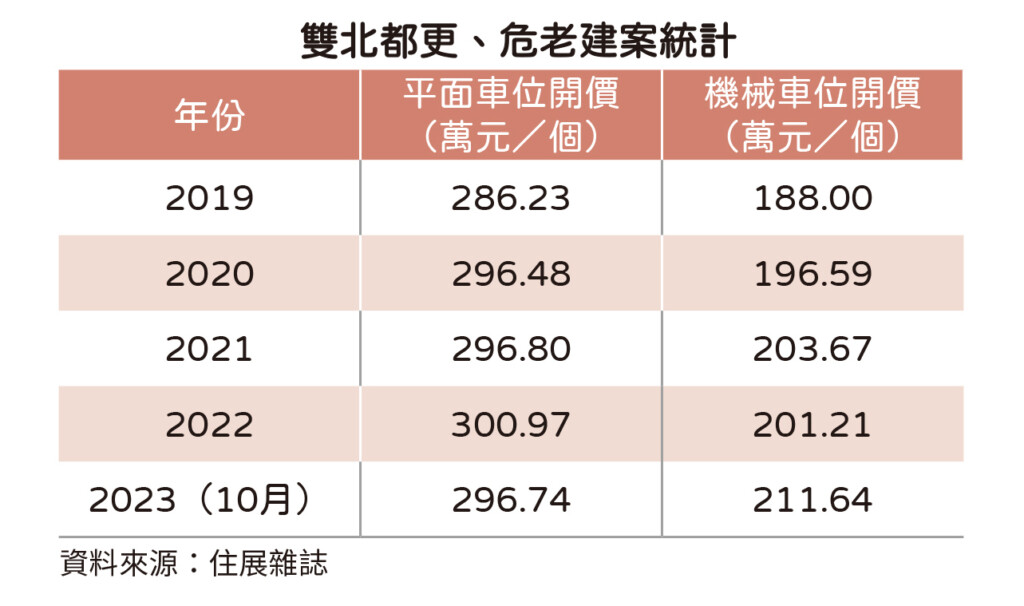 經統計雙北市歷年都更、危老建案車位開價,今年截止10月底,平面車位平均開價為296.7萬元/個,機械車位平均開價是211.6萬元/個。與2019年相比,機械車位的開價已提高23.6萬元/個,漲幅約12.6%,反觀較受市場歡迎的平面車位,開價僅上升10.5萬元/個,漲幅約3.7%。