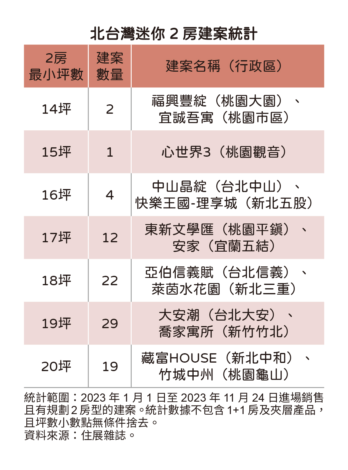 若以坪數區分,今年北台灣公開銷售的迷你2房建案中,坪數最小為桃園市區「宜誠吾寓」及大園「福興豐綻」,2房房型僅14坪,桃園觀音「心世界3」則推出15坪2房房型,台北中山「中山晶綻」及北投「夏沐時」、新北五股「快樂王國-理享城」、宜蘭五結「國恒青淞」,都有16坪2房規劃。其餘建案最小2房房型介於17至20坪之間,並以規劃有19坪2房房型的建案數量達29個最多。