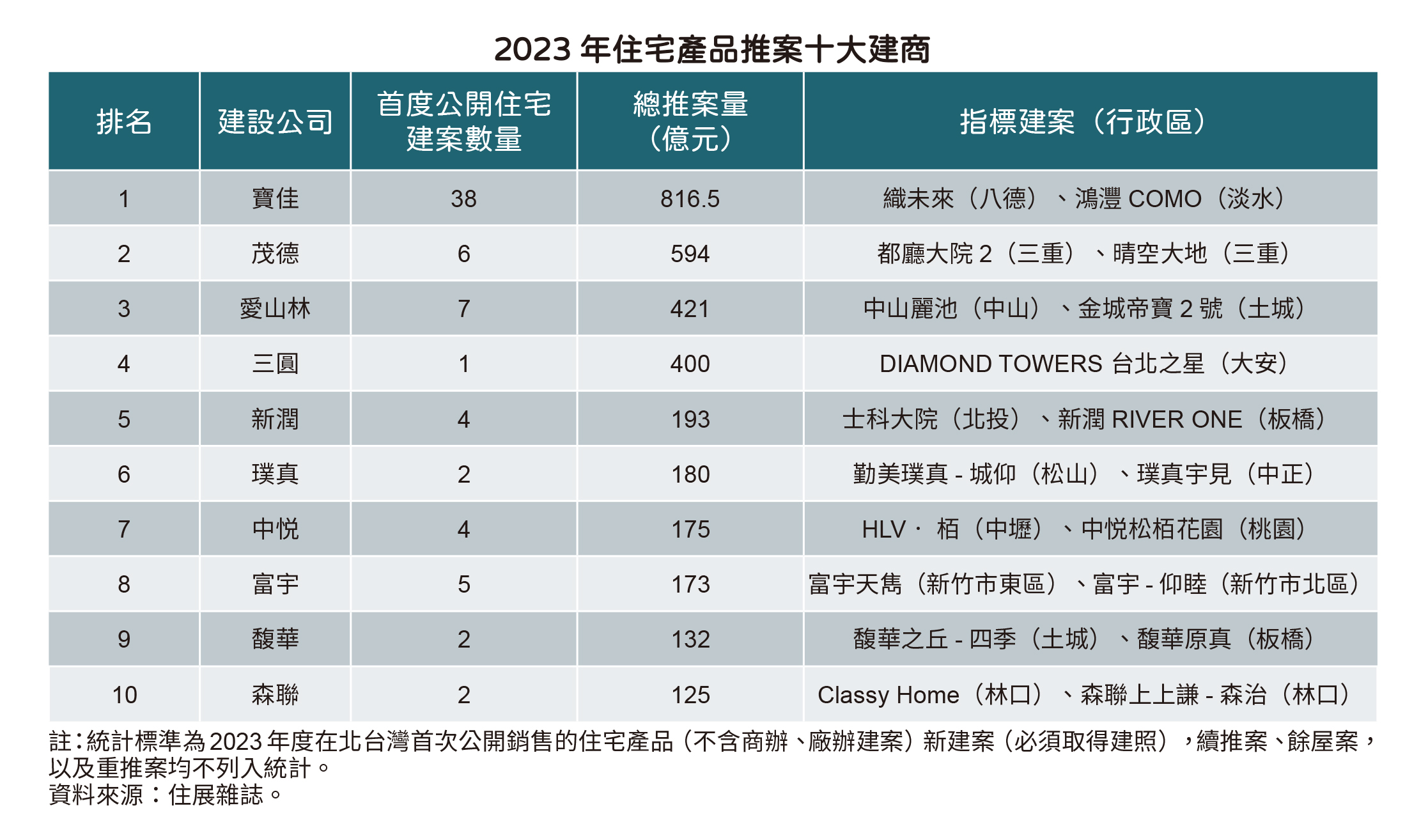 住展雜誌統計北台灣2023年住宅產品推案(不含商辦、廠辦建案),十大建商(依推案量計)依序為寶佳、茂德、愛山林、三圓、新潤、璞真、中悦、富宇、馥華、森聯,前十大建商推案量介於125億元至816.5億元。去年房市利空罩頂,建商延後推案,十大建商住宅推案量總計約為3209.5億元,相比2022年少了約7.7%,推案大戶寶佳也量能修正,年度推案量跌破千億元,不過還是六度奪下推案王寶座。