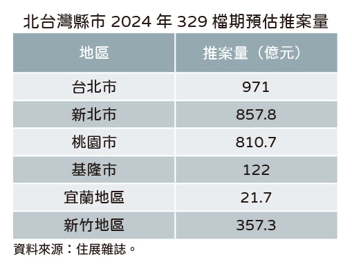 更值得一提的是基隆市,推案量預估122億元,此量體雖然僅是熱門縣市的一個大案量,但暖暖區的話題案「甲山林城上城2-美麗上城」為一大看頭,且因為近期基隆港區新案攀上高價,讓基隆市房市後市可期。 陳炳辰分析,北台灣還有不少熱門地帶早先傳出將有新案表現,包括桃園市的機捷A7、A20站生活圈,和新北市與新竹地區多個重劃區,眼下還未在329檔期發酵,但下半年有美國大選、新版囤房稅上路等變數,是否趕在適逢新總統上任,或有慶祝行情的520檔期大推特推,很快就有答案。