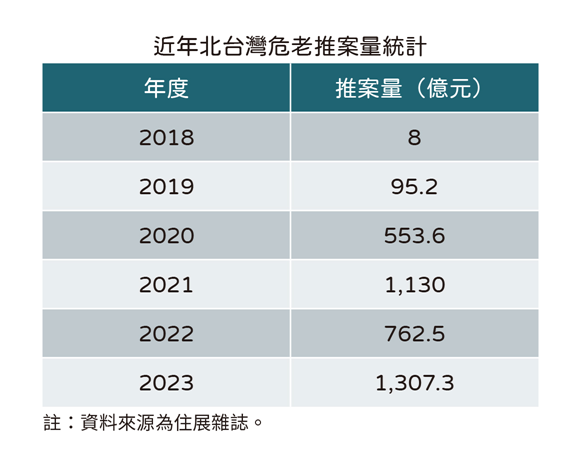 陳炳辰指出,從2017年公布實施危老條例,北台灣危老推案量逐年跳躍成長,2018年還只有8億元的危老案量,到2021年突破千億元大關,熱度可見一斑。而2022年因連續升息造成房市大環境震盪,又原物料上漲干擾危老常見的小基地面積成本難控,危老推案量下修,到了2023年雖然多有建商因不確定變數而延後推案,但不乏危老所在地段佳,且戶數不多,風險趨低,反成為亂世定心丸,印證在數據回溫上。