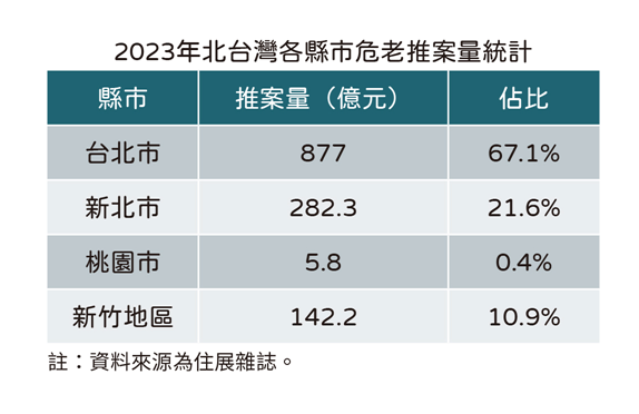 地震喚起民眾對於老屋居住安全的危機感,但有意危老整建可得抓緊腳步,危老條例規畫的時程容積獎勵將於明年畫下句點在即,回顧危老案的推動,據住展雜誌統計,去年北台灣危老重建案推案量約1307.3億元,遠超過2022年,年增幅高達71.5%,也是新高紀錄,成效不錯。其中台北市為大宗,來到約877億元,占比67.1%,再則為新北市的282.3億元,占比21.6%。