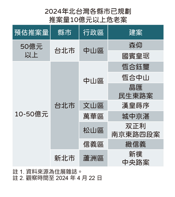 表三、2024年北台灣各縣市已規劃預估推案量10億元以上危老案