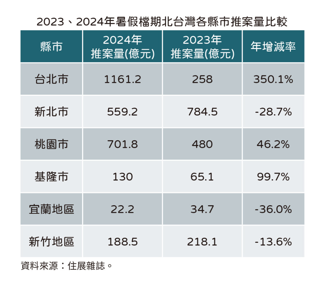 而去年房市環境不確定因素多,建商一整年都且戰且走放不開,兼之平均地權條例修正案7月上路,暑假檔期弱勢更屬應當,來到今年房市翻揚,兩年相較回溫50.1%就不意外。桃園市、基隆市、台北市同比成長46.2%至350.1%,最值得注意莫過於台北市,推案量突破千億元,達同期新高紀錄,比去年同期爆增350.1%,量能占了北台灣超過4成,成為熱況主因,其中也在於文山區「元利四季莊園」海量推案助攻,凸顯台北市門牌鍍金,長期看好,建商趁勢推案,毫不遲疑。一案定江山的還有基隆市,暖暖區破百億案量的「甲山林城上城2-美麗上城」於此時間點開案,讓推案量較少、比較基期低的基隆市兩年相比有倍數成長。