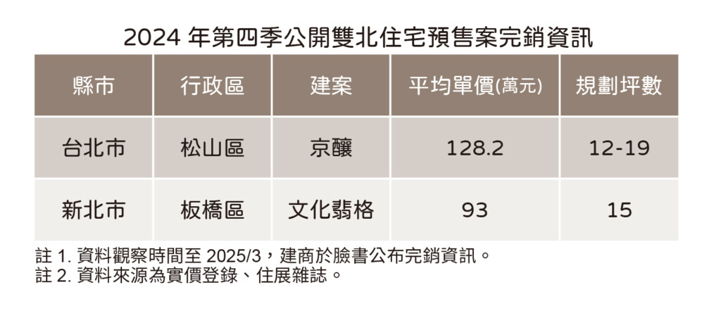 住展雜誌彙整去年第四季公開新案資訊,雙北一共進場51個住宅產品預售案,到目前為止於建商臉書粉絲團公布的完銷資訊,僅台北市松山區捷運南京三民站生活圈的「京釀」,與新北市板橋區捷運江子翠站生活圈的「文化翡格」,雙北Q4的住宅預售案推案數量完銷佔比3.9%,慘況不言可喻。