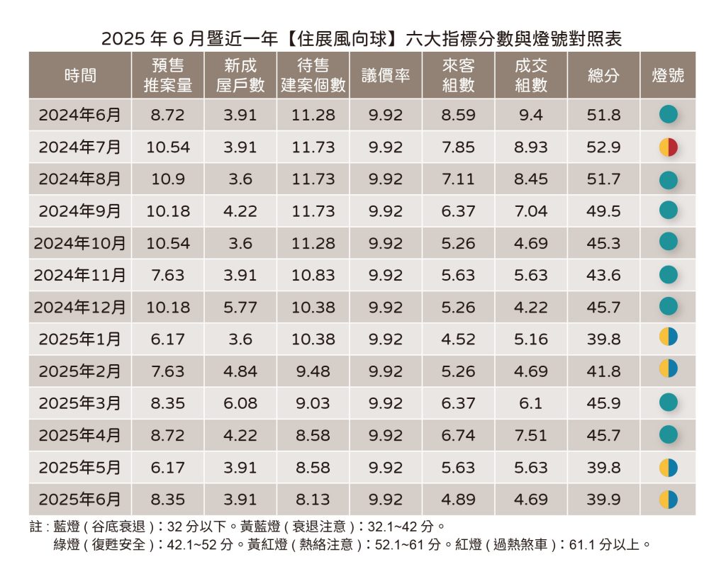 代表北台灣新建案市場概況的「住展風向球」,6月燈號維持衰退的黃藍燈,分數是39.9分,慘況不見起色,六大構成項目呈現「一升、二平、三降」,預售屋推案量上升,成交組數、來客組數、待售建案數分數下滑,新成屋戶數、議價率持平。