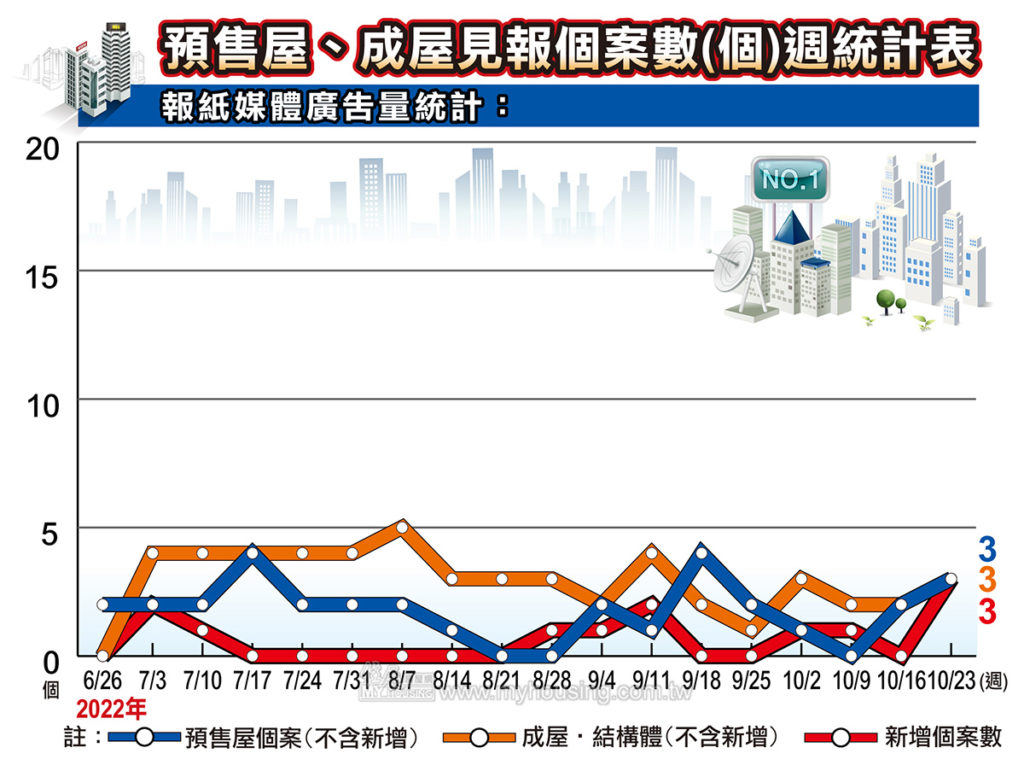 上週(10/17~10/23)北台灣建案報紙廣告批數為260批,相較前週驟增150批,刊登報廣的建案數量9個,也是較前週驟增5個。上週第一次刊登報廣為「天空之邑」、「德鄉敦苑」;重新刊登報廣為「綠意順光天下」、「榮馥大院」、「日初不老莊園NO.2」、「璟都米蘭」;持續上報廣的有「新光人壽總統傑仕堡」、「弘暉富川」、「憶聲智匯科技園區」。