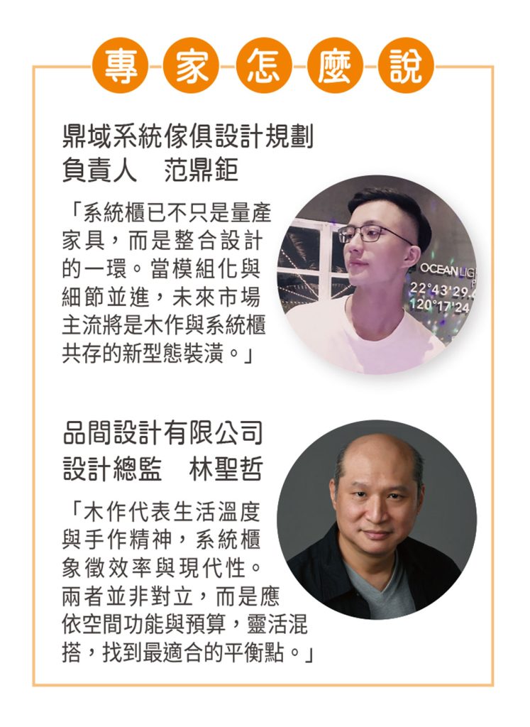 然而,兩位專家都認為,系統櫃正快速成長,未來潛力甚至高於木作。林聖哲指出,系統櫃產業已從代工轉向整合設計與安裝的一條龍服務,效率與品質同步提升;范鼎鉅則觀察,隨著小宅化趨勢與極簡風盛行,系統櫃更能在有限空間中發揮效能,成為主流選項。