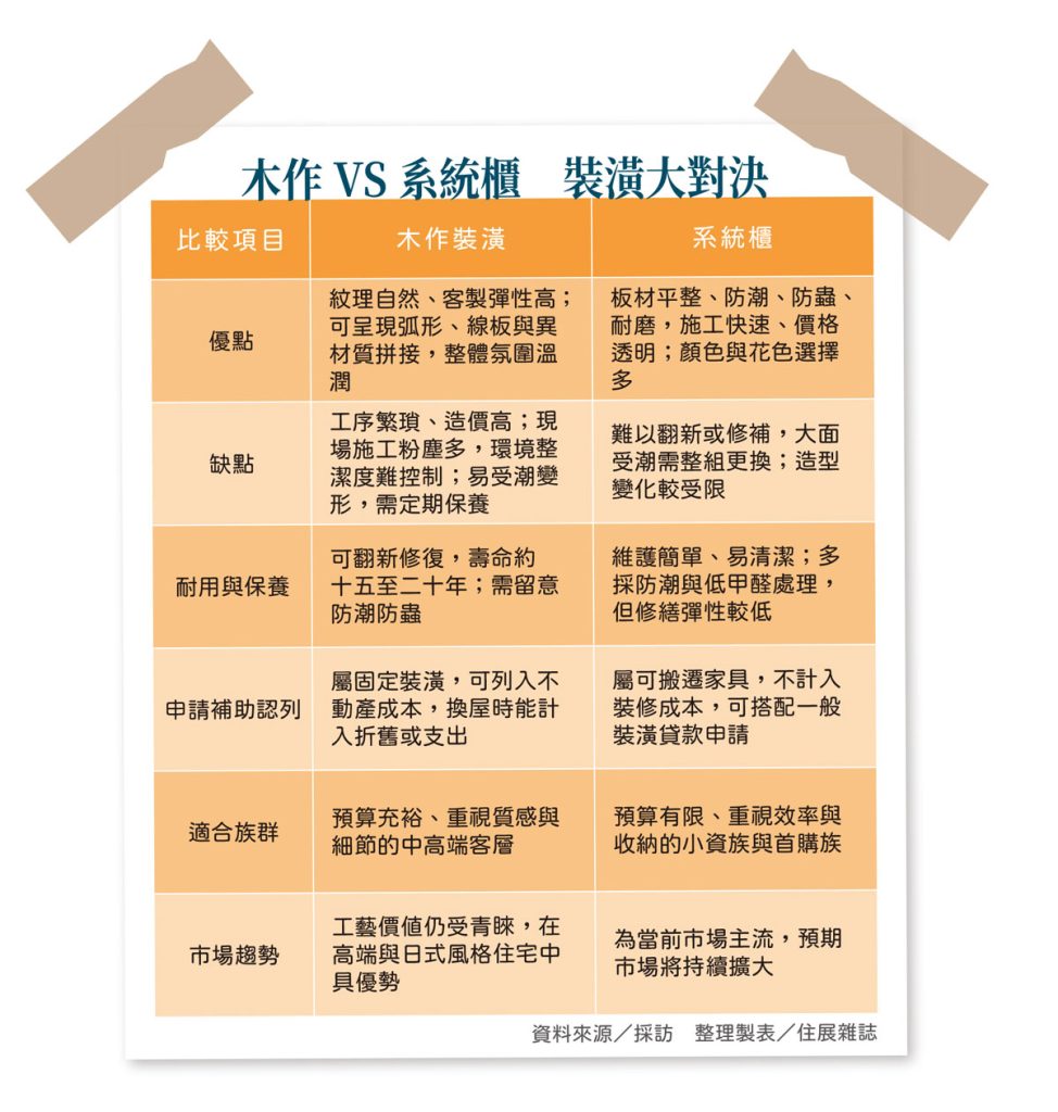 最終,這場對決不僅是工法選擇的比較,更反映生活型態轉變:木作象徵手作溫度與傳統工藝,系統櫃代表現代效率與功能整合,而「混搭」正是當代住宅最貼近現實的答案。