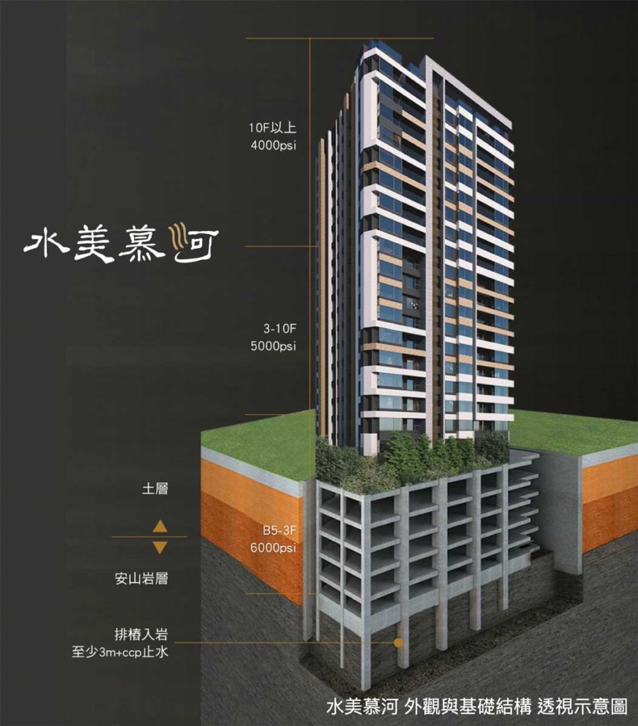 「水美慕河」建築基樁深入岩盤3米;並且三樓以下混凝土磅數達6000PSI,超越同級規格,讓結構堅若磐石,建築固若金湯!