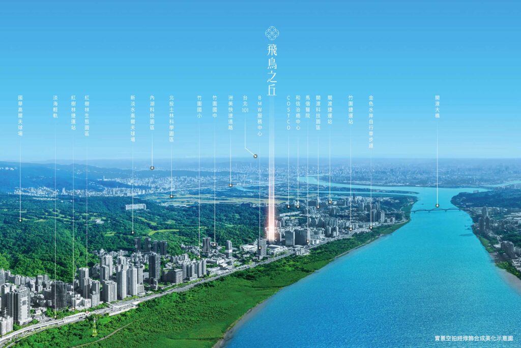「飛鳥之丘」位竹林路,與北市僅一橋之隔,開車15分鐘可達北士科,漫步無須十分鐘,就抵捷運竹圍站,北車國門樞紐、永康國際商圈、101時尚特區近在咫尺,城市輕鬆跨界,繁華愜意轉身可得。