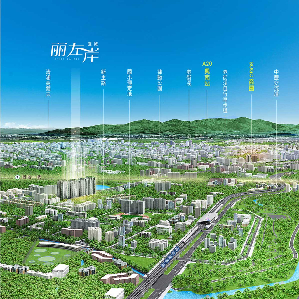 宜誠【丽左岸】座落A20中軸大道興北一路,一路直達A20捷運站(距離約650米),基地三面臨路、超大面寬,緊貼一座公園,立地條件相當優渥;全區規劃四大棟建築,產品為2-4房,符合市場需求主流。建築規劃陳永振建築師,外觀設計袁子健,公共空間黃羽菁、景觀設計鄭如珊、燈光計劃日大照明,大師雲集皆一時之選,共同打造專屬A20的法式浪漫,此外,獨家專利SRC萬型雙柱工法,搭配多項優質精選建材,讓安全與品味一次同步升級。在A20邂逅⼀款迷人的法式生活,宜誠【丽左岸】歡迎您預約鑑賞。
