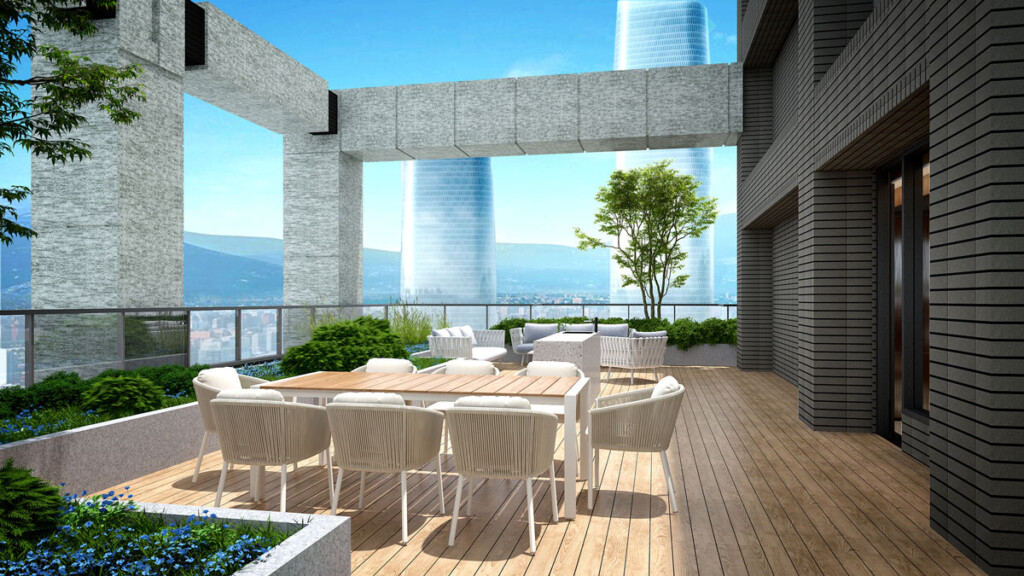 一樓落地窗外以姿態優雅的楓香、象牙木及特殊造型的飄型樹,搭配低層的灌木綠叢,感受繁華市心中的綠島。頂樓空中花園東望101大樓與台北車站,北眺五指、觀音山,南面雙子星雙塔,恢宏的景觀視野,洗滌凡塵喧囂。特別規劃都會菁英最鍾愛的RV風格,把自然休閒的渡假場景,召喚到頂樓空中花園,創造一種「開闊景觀、時尚休閒」的渡假氛圍。