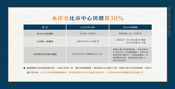 然而首善之區台北市多數行政區已站穩3位數的房價高點與新北市的價格產生一定的差距。大台北地點好的房價平均80~90萬/坪,促使購屋者轉向新北市尋找標的。台北市房價單價高、總價大,一般民眾難以負擔,甲山林集團在板橋水岸首排推出『濱河帝景』建案,因土地購置早,且無地主持分,土地全數自有,有別於一般水岸宅規劃,本次推出稀有小坪數產品,總價1288萬起,符合新青安條件,吸引購屋者。住商不動產企劃研究室執行總監徐佳馨的分析,指出了河岸景觀宅在市場上受歡迎的幾個關鍵因素: