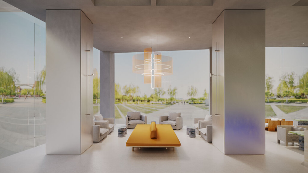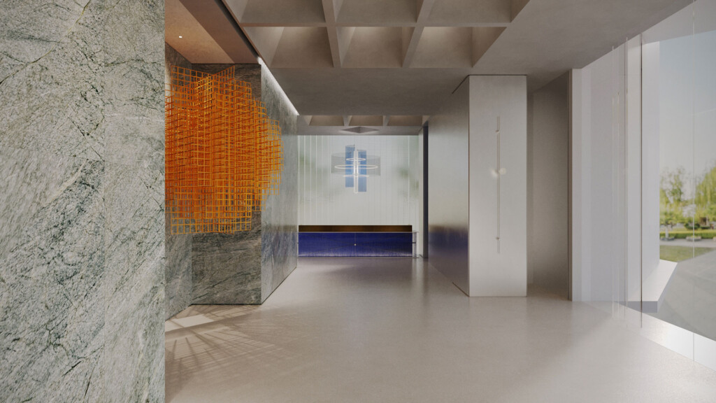 空間設計邀請「水相設計」團隊,以幾何美學語彙詮釋未來感住宅場域。低調銀灰金屬、自然系配色、大面進口石材牆面與摺紙天花板交織,營造出現代博物館概念的沉穩氛圍。空間設計回歸純粹、清麗與大氣,讓公共空間成為文化意識的當代藝術場景。