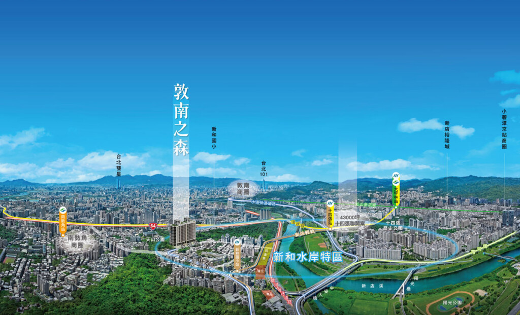 【敦南之森】步行約4分鐘即可抵達新和國小站,約10分鐘接軌南勢角捷運站,雙捷運優勢,通勤便利。搭配國道三號、水源快速道路、新北環快與64快等多重路網,15分鐘即可直達敦南生活圈,生活、工作、休閒無縫接軌。