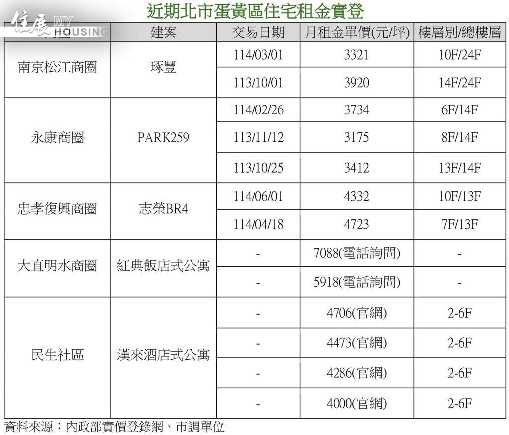 此外,民生社區的漢來酒店式公寓,租金落在每坪4000~4700元,對照周邊中古大樓行情約126~140萬元,投報率約3.8%;大直明水路段的「大直紅典飯店式公寓」租金介於5000~7900元,成交單價僅約109萬元,租金報酬率上看5.5%。