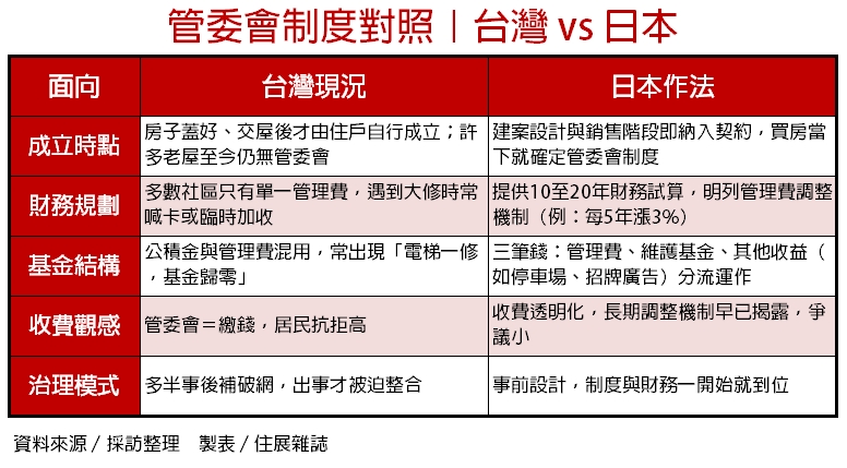 台灣的公寓大廈管理條例已經30年,但實務上,許多大樓至今仍未成立管委會,甚至等到公安、消防出事,或政府開罰單,才被迫補破網。這樣的「事後治理」,正是居住安全的黑洞來源。對比之下,日本的制度設計,則早已把管委會納入房屋銷售與居住的基礎架構。