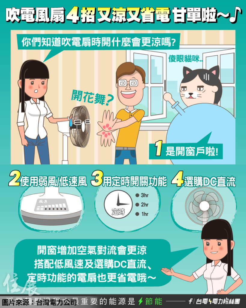 此外,台電也提供了一些使用電風扇的省電技巧,例如可以調整為弱風或較低風速,也可以選擇具有定時開關功能的電風扇,或是選購DC直流電風扇。同時,定期清潔和保養電風扇也是非常重要的,如果發現電風扇運轉不順暢或有異音,最好將其送修以確保使用的安全。