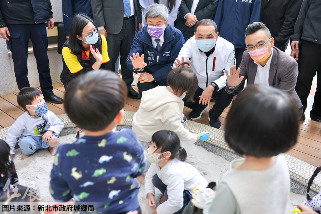 侯友宜也偕同陳建仁至社宅內林口文仁非營利幼兒園參觀,與小朋友玩沙、推彈力球。(圖/新北市政府城鄉局)