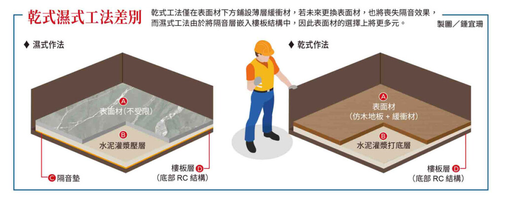 目前主流隔音工程作法可分為乾式與濕式兩種工法。乾式工法只需在樓板結構上先打底,再直接鋪設帶有薄層緩衝材的表面材就可以了,例如SPC地板或超耐磨仿木地板。雖有成本低、施工快的優點,但未來若拆除表面材,薄層的緩衝材也將一同被移除,隔音功能將完全喪失,無法達成一次施工就永續隔音的目標。