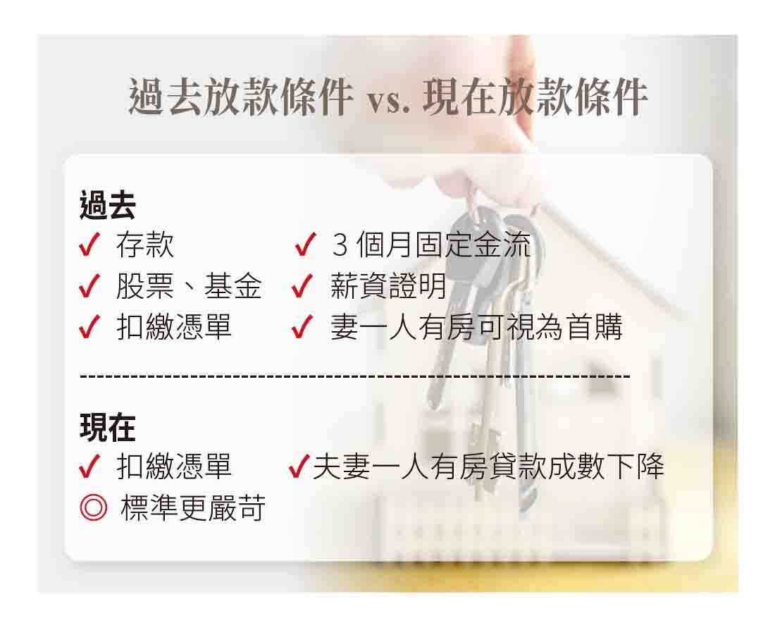 本刊調查,一對愛情長跑20年的夫妻,曾為大學班對,如今皆為41歲。兩人新婚時為就近照顧妻子的母親,選擇在北市文山區娘家附近購屋。後來母親過世,加上先生工作調動,全家原計劃搬遷至林口展開新生活,卻正好碰上央行祭出史無前例的「第二戶限貸五成」規範。